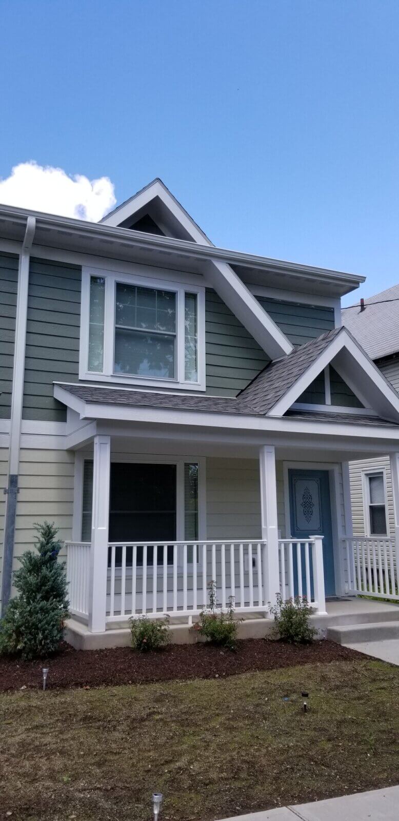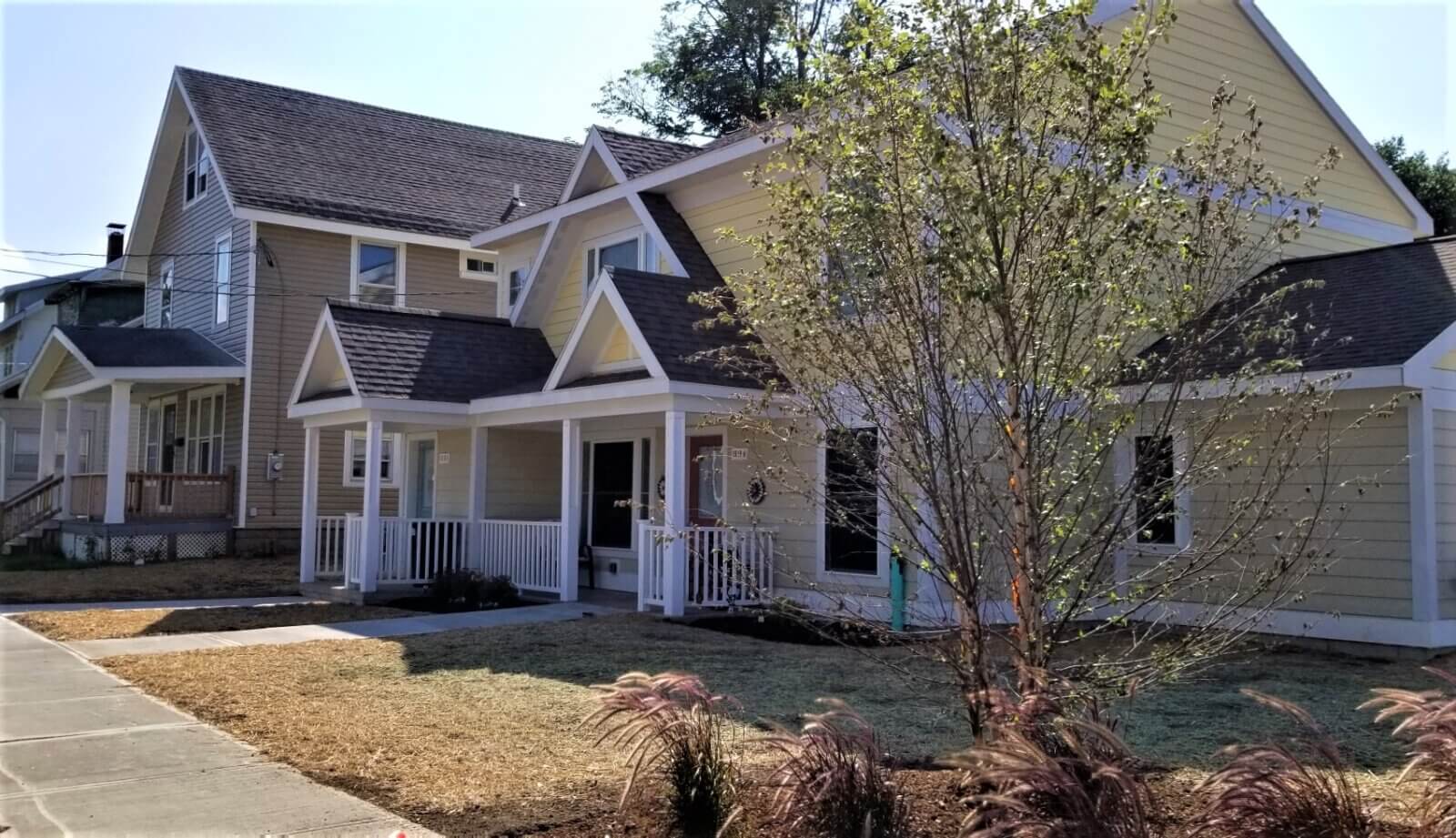 The architecture of the individual residential structures reflects a transitional style. The buildings are designed to reflect existing contextual elements of architecture, such as clap board siding, hung windows, and extended gables, which impart a sense of scale and privacy at separate unit entrances, while giving the appearance of a single-family home. The design is intended to bridge the existing gaps of the area landscape with traditional housing forms that both enhance and restore the existing fabric of the neighborhood. Most importantly, the design is intended to convey an expression of community restoration, unity and renewal that is appropriate to its time and place.